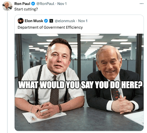 The budding bromance between Elon Musk and Ron Paul tackling government efficiency? The promise of keeping busybodies off Main Street is better than grabbing ice cream together. Especially when less than 30% of every tax dollar makes it to the door of the person it’s intended to help.